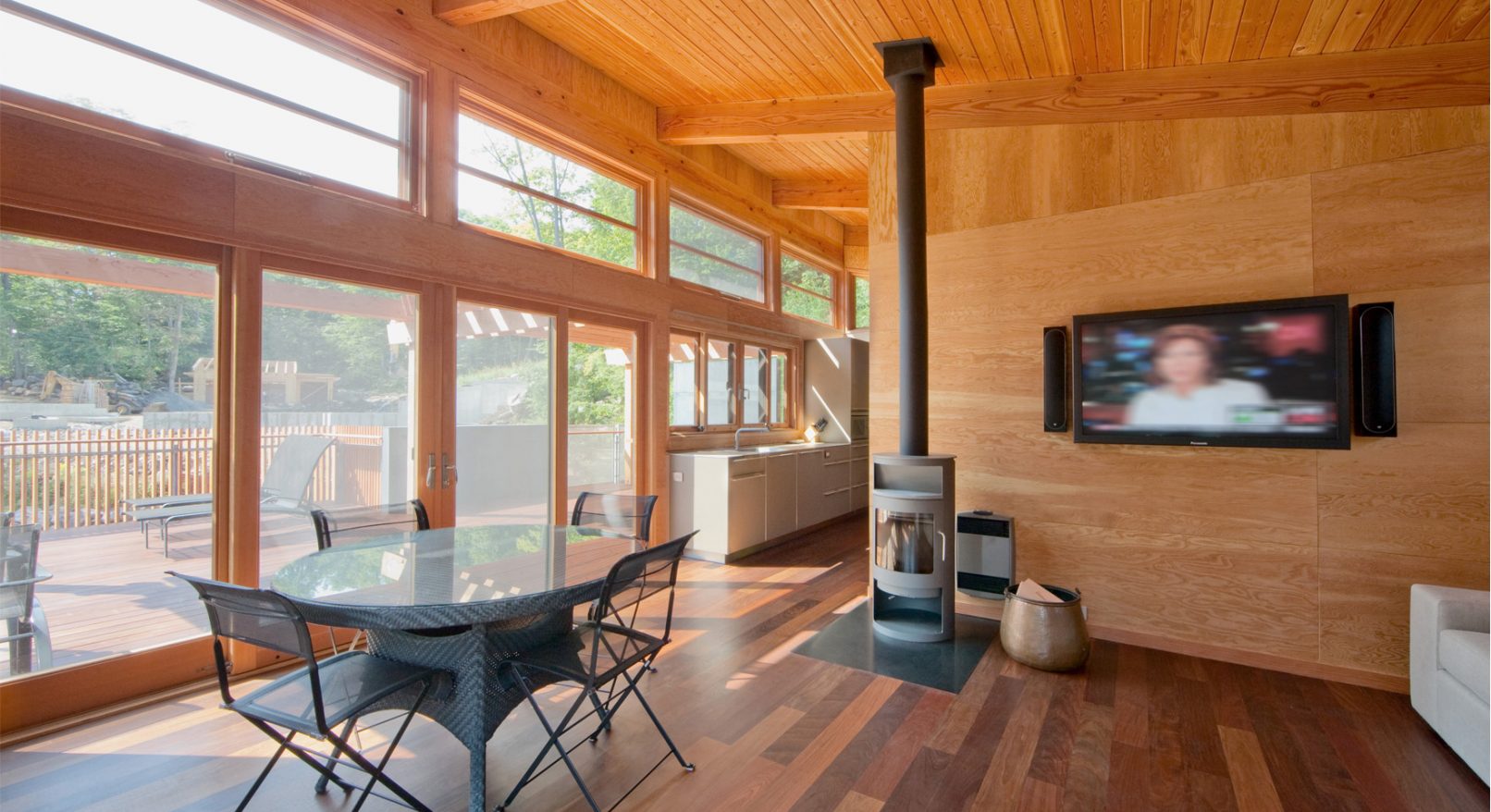 A new exterior staircase positioned on the lower deck was introduced as a welcoming gesture in connecting the lower deck to the second level roof terrace. This large south-west facing terrace acts as a central outdoor gathering space and focal point for the property. The second storey is designed as a self sufficient sleeping cabin and is comprised of one bedroom, a three piece washroom, a kitchenette and connected living space. The cabin combines rustic materials with minimalist detailing to create a sheltering yet contemporary character for the interior spaces. The cabin is constructed as a hybrid post and beam/wood stud frame structure with exposed Douglas Fir roof rafters and decking. Framed on three sides with wood studs and punched openings, the fourth side of the cabin opens up to the roof terrace with an exposed post and beam structure and extensive glazing. Douglas Fir plywood wall panels are used throughout and are contrasted in colour and finish by Ipe wood flooring and detailing both inside and out.