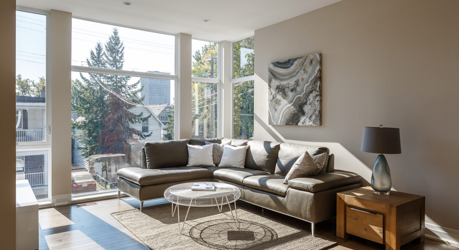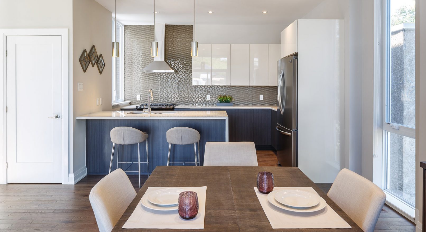 These innovative semi-detached homes were designed with urbanites in mind, providing open living spaces. The homes range from 1,700 to 1,830 sq.ft. over three levels, plus over 400 sq. ft. of finished floor space in the basement. The two rear units are 26 feet wide with three bedrooms, and the two front units are 20 feet wide with two bedrooms. In each unit the ground floor level holds a generous entry space with walk-in closet, laundry room, den, and washroom. The second level’s open plan provides an ideal space for families to spend time together in the interconnected living area, dining area, kitchen and covered porch. The back units feature a small backyard.