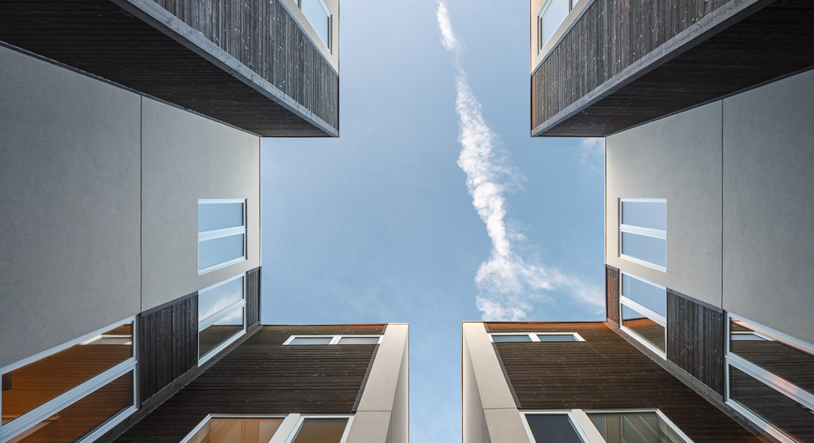 The slim homes are filled with natural light thanks to strategically placed floor to ceiling windows. In the kitchen, elevated corner windows maximize daylight and provide broad views of the street while maintaining privacy. The small ground floor footprint allowed for the creation of an internal parking courtyard. Each unit has a covered porch and a covered parking space with a secure outdoor storage room.