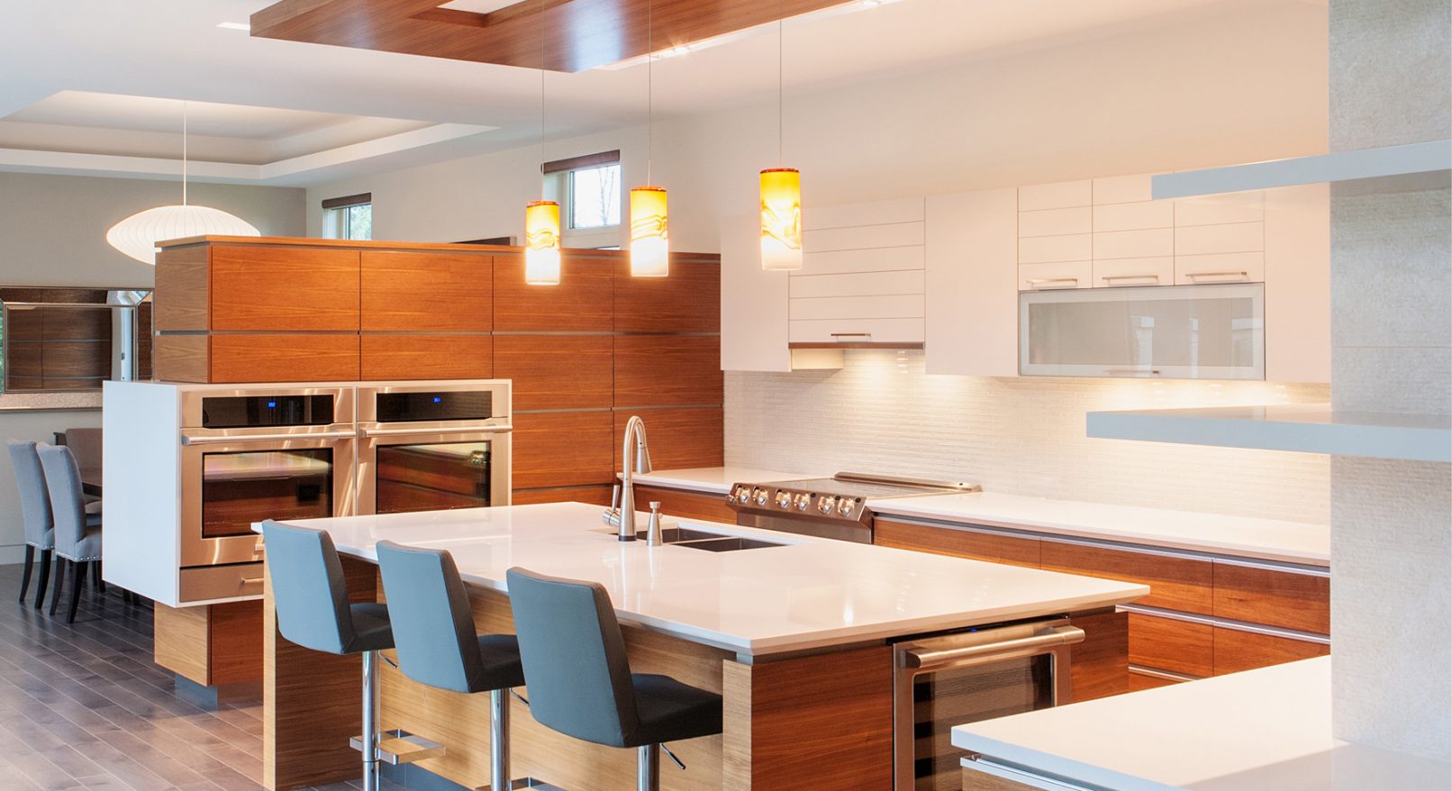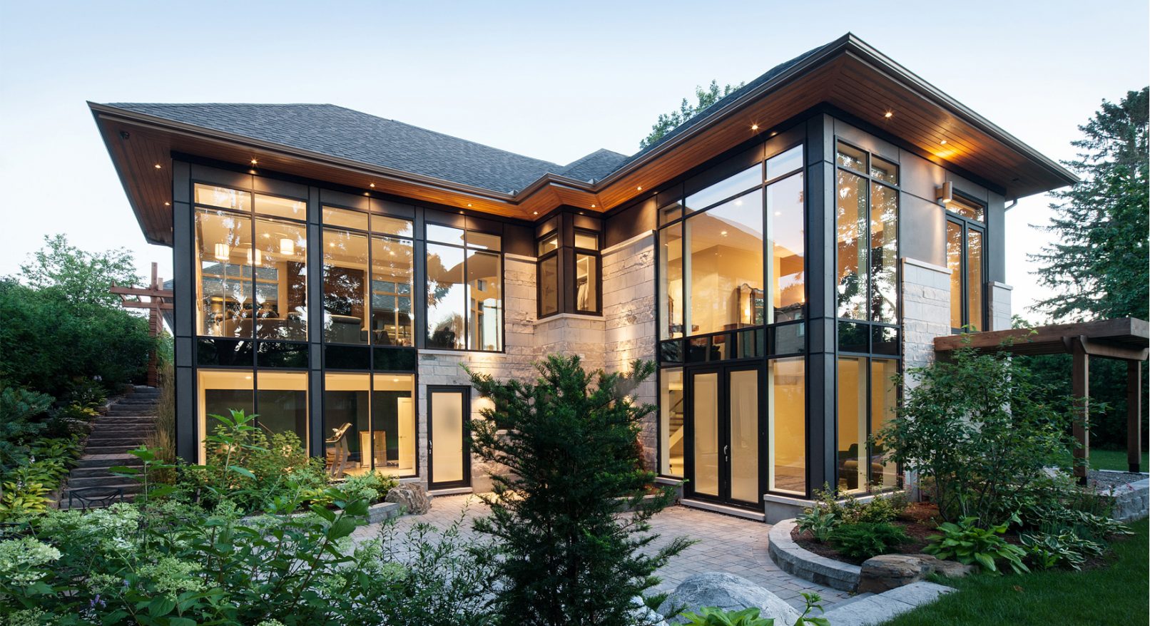 The exterior of this custom home is clad in French limestone and fibre cement board. The interior materials include limestone tiles, grey stained maple flooring and walnut cabinetry with off-white accents.