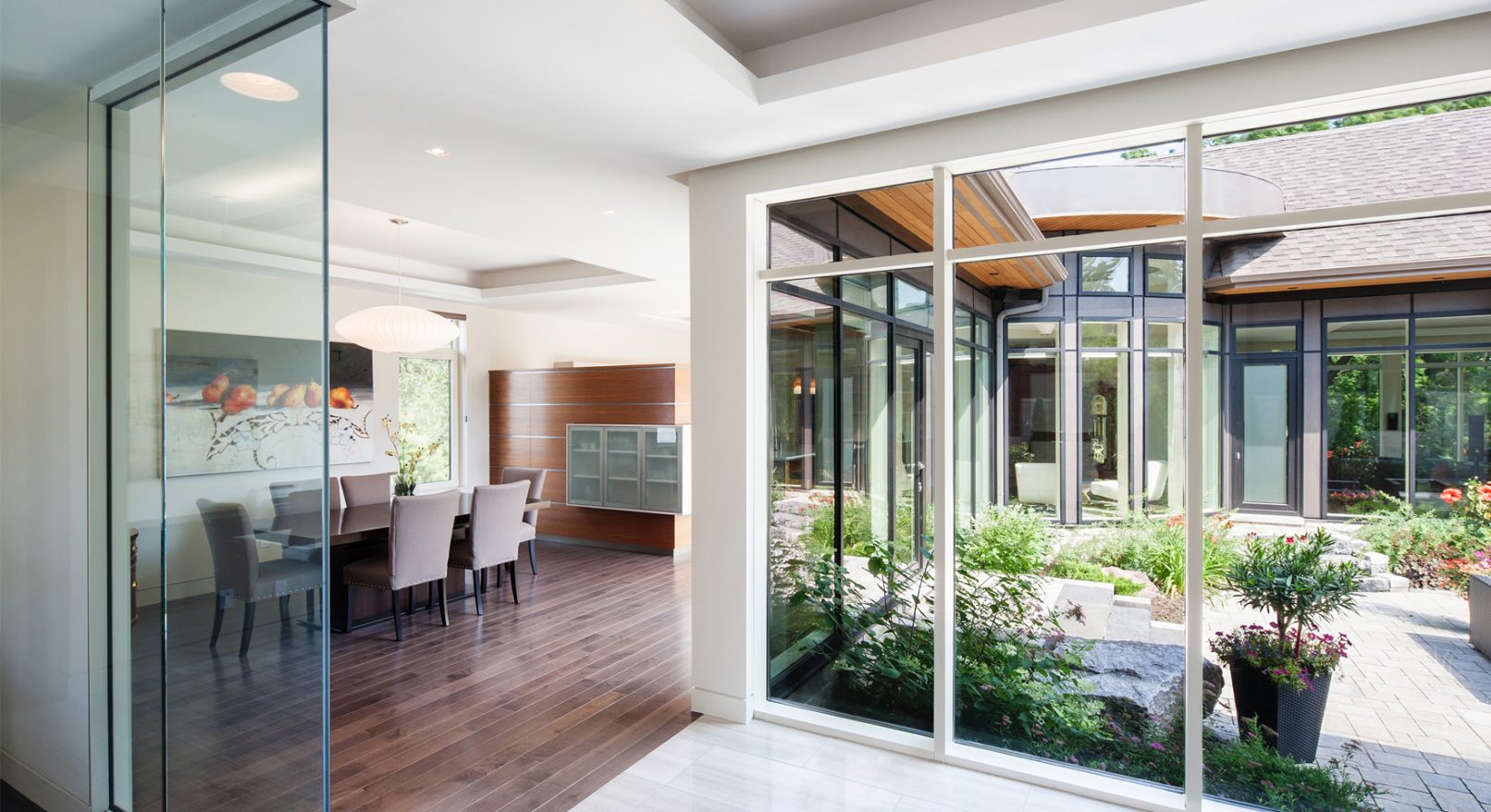 Providing an interior courtyard effectively brings south and east light into the home while creating an oasis away from the busy street traffic.