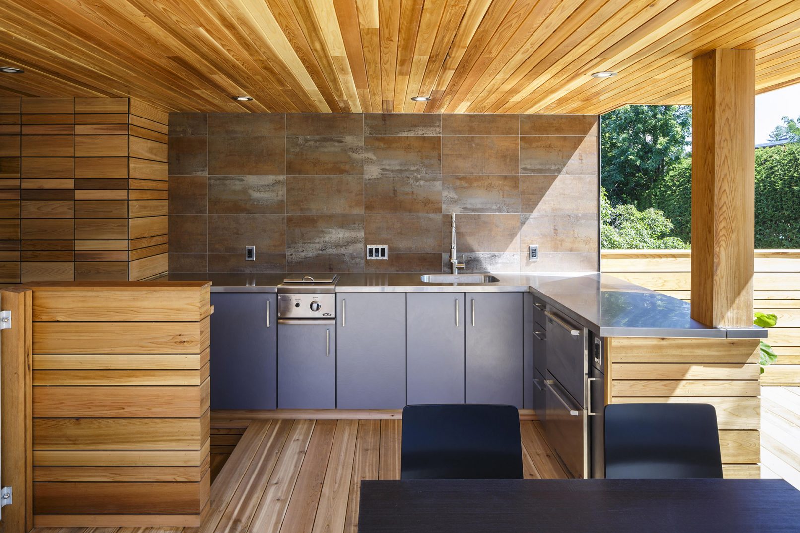 Their intent was to cook outdoors as many days of the year as possible. To this end the project incorporates a sheltered kitchen, and a gas fire pit all on the main living level.
