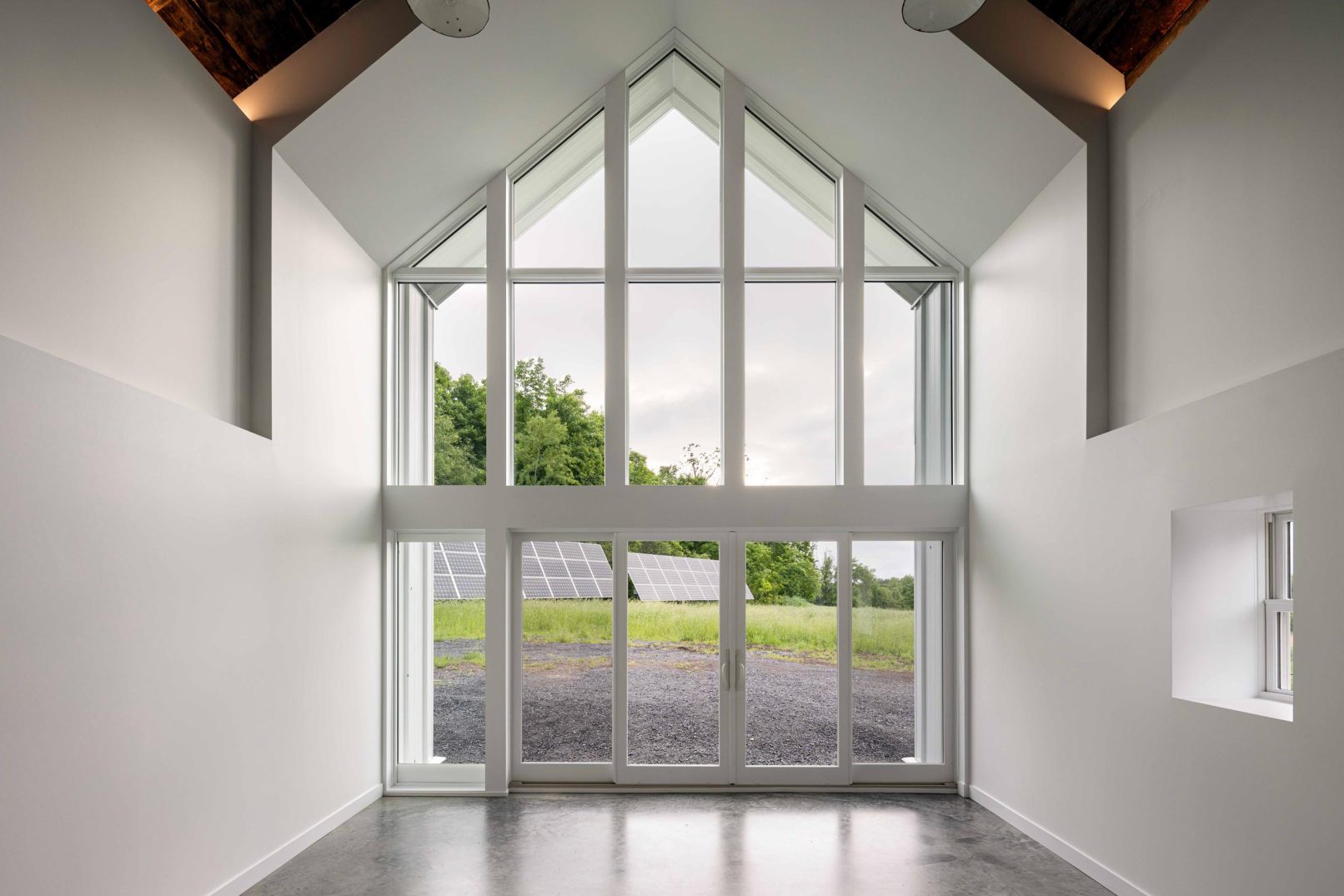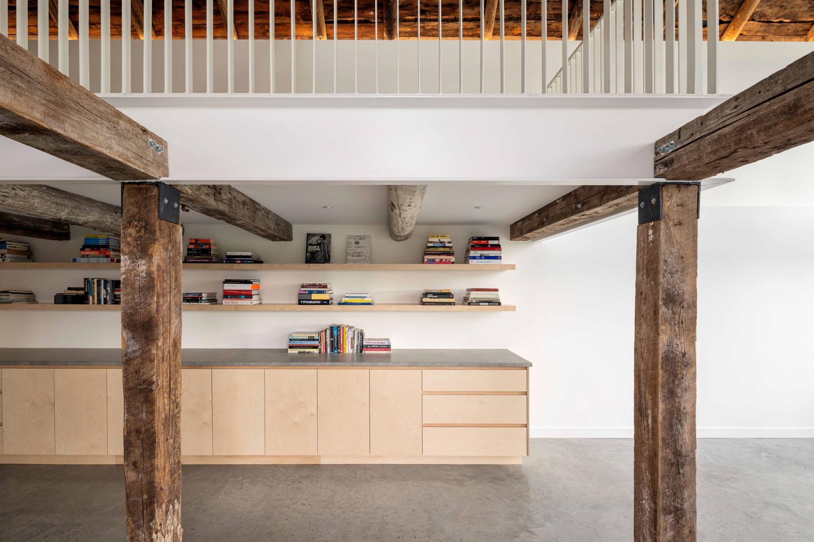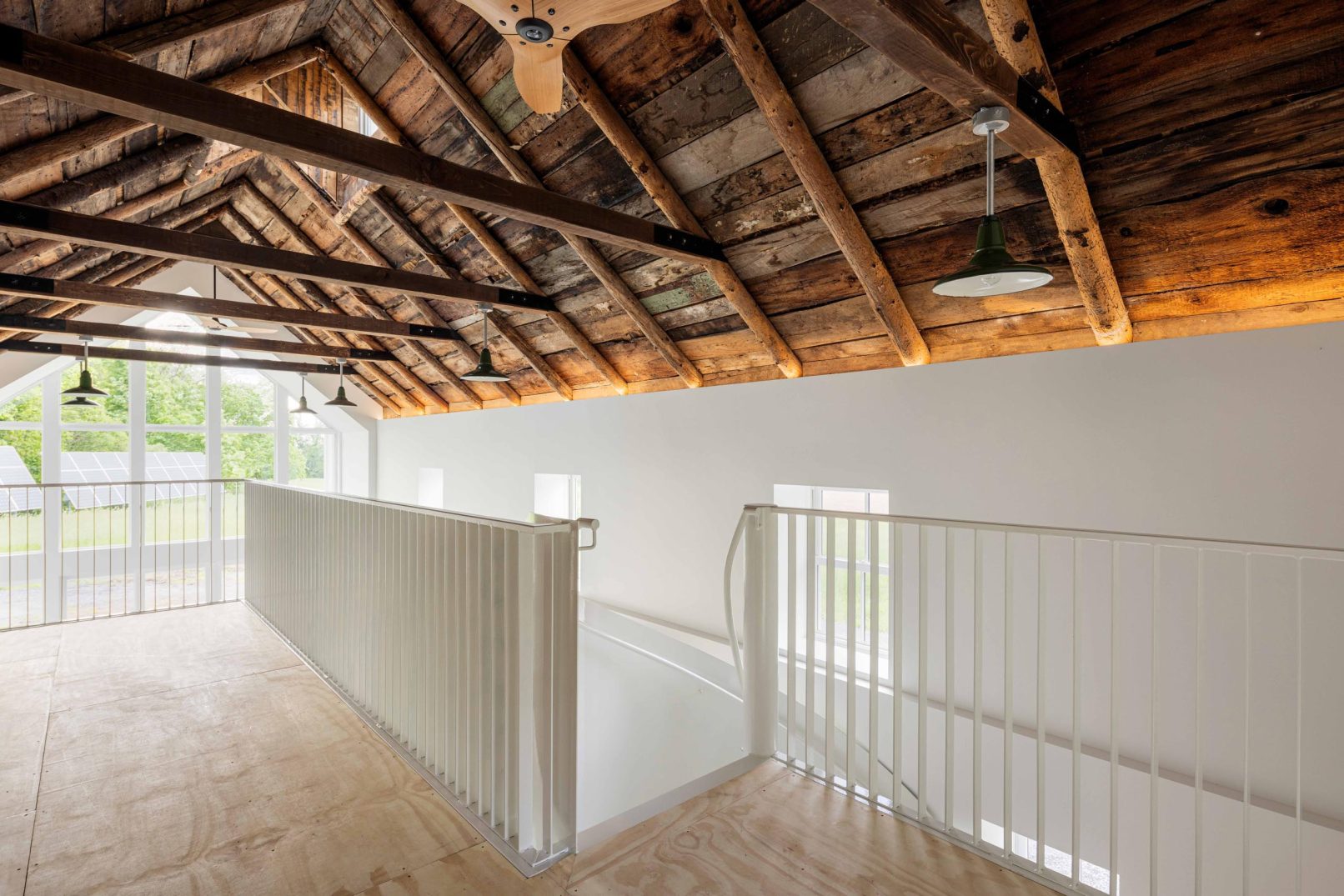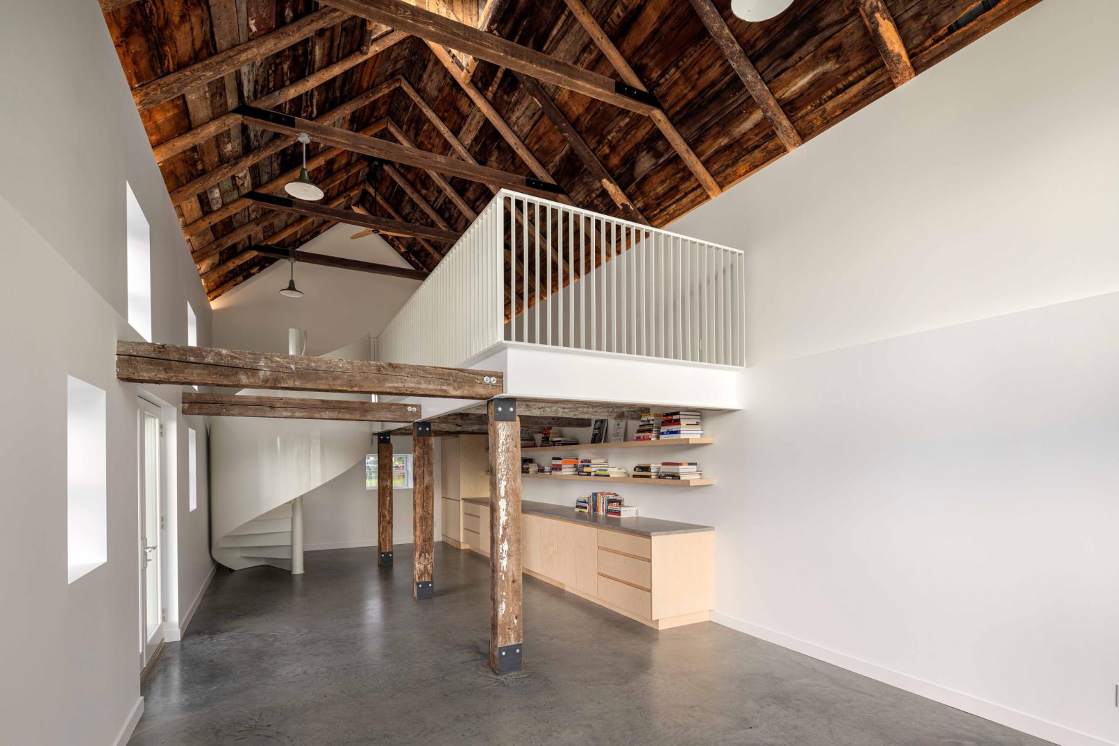 Key preservation efforts included maintaining the barn’s unique exterior wall structure, cladding, exposed wood roof structure, and post-and-beam floor framing. Enhancements focused on functionality and sustainability, such as enclosing part of the post-and-beam floor structure to create a work mezzanine, insulating interior and exterior wall assemblies to required R-values, and installing new windows that matched the existing aesthetic.