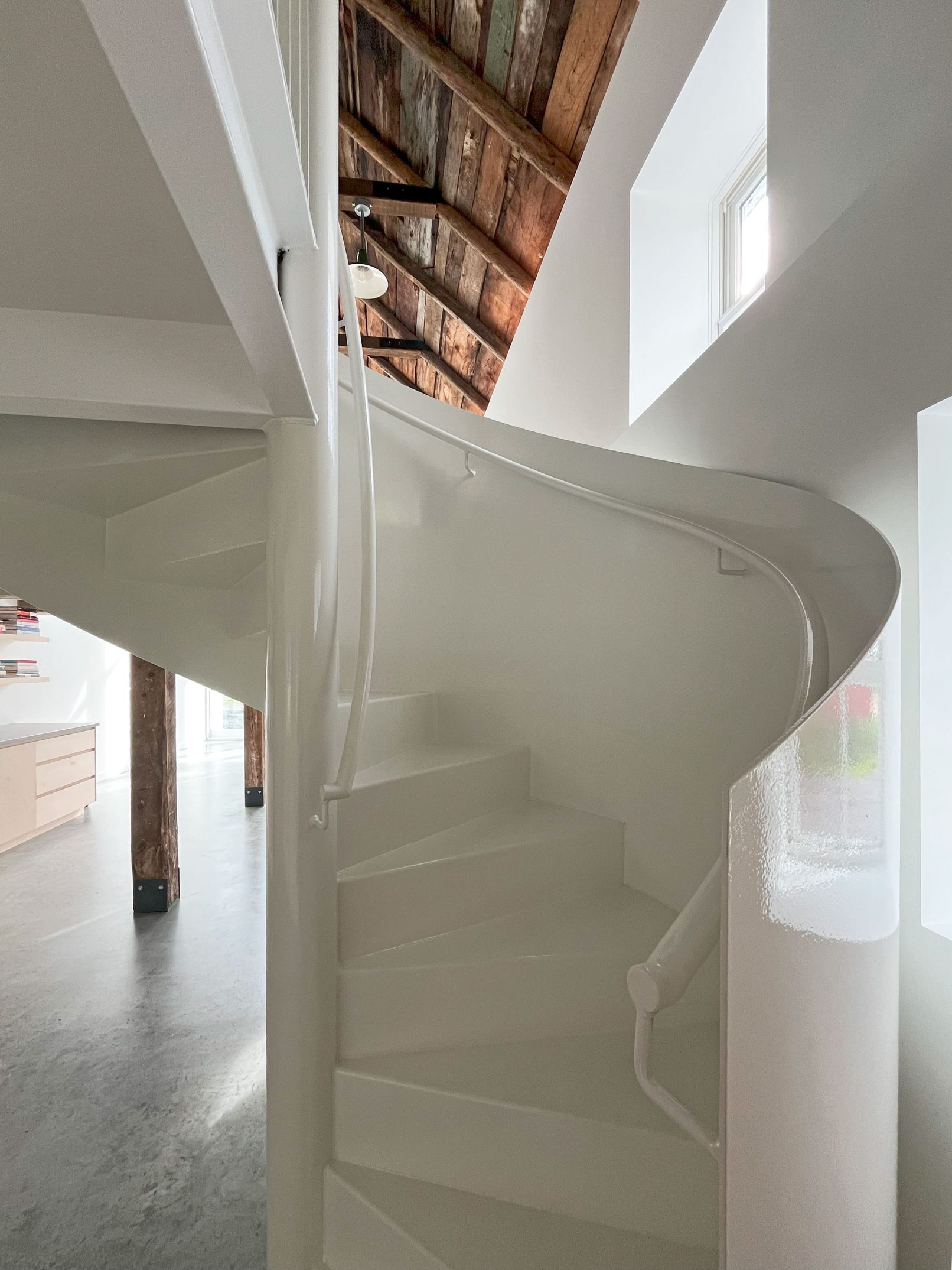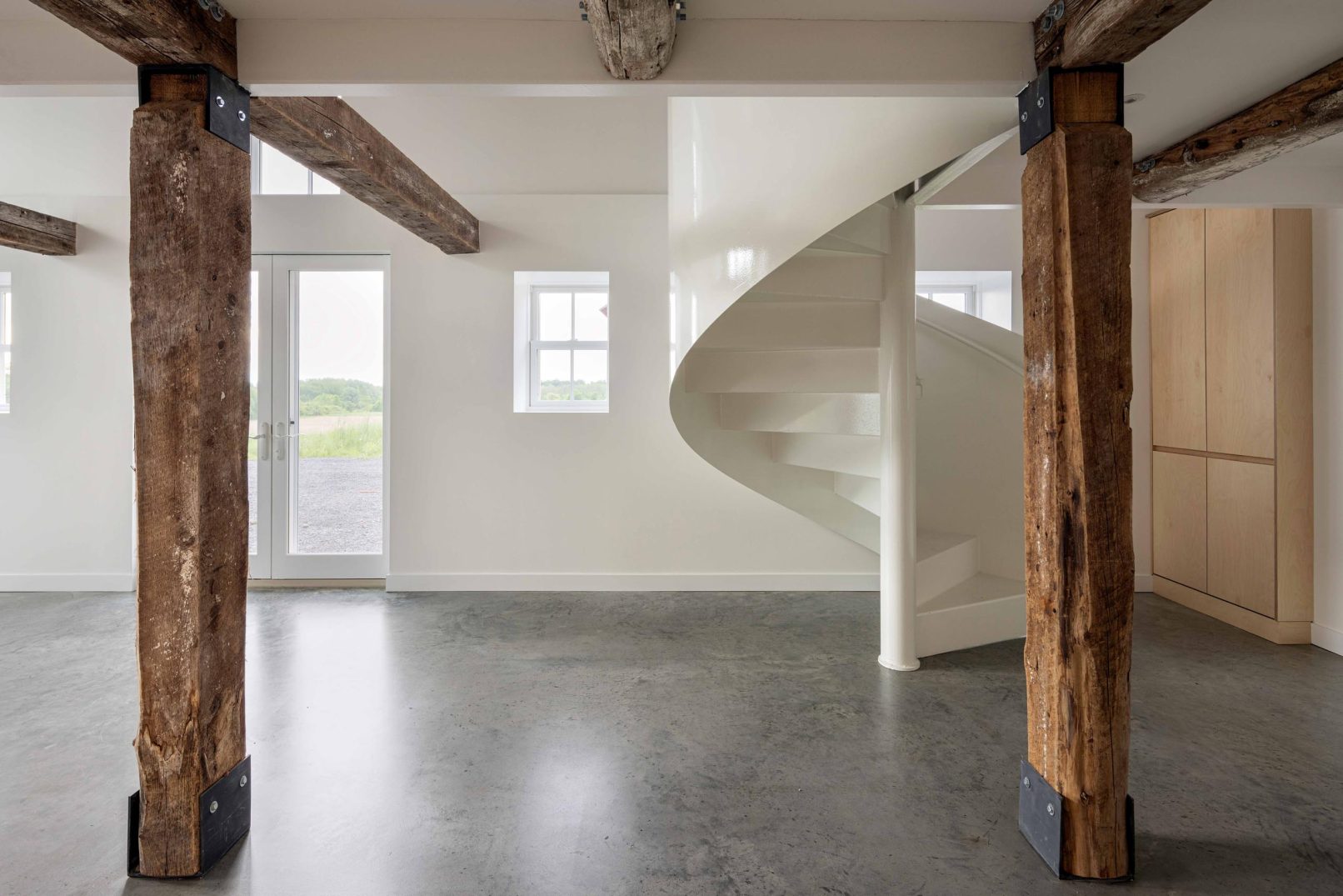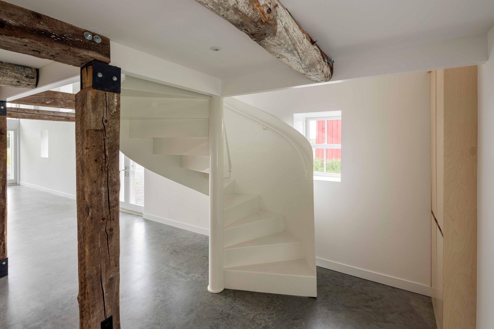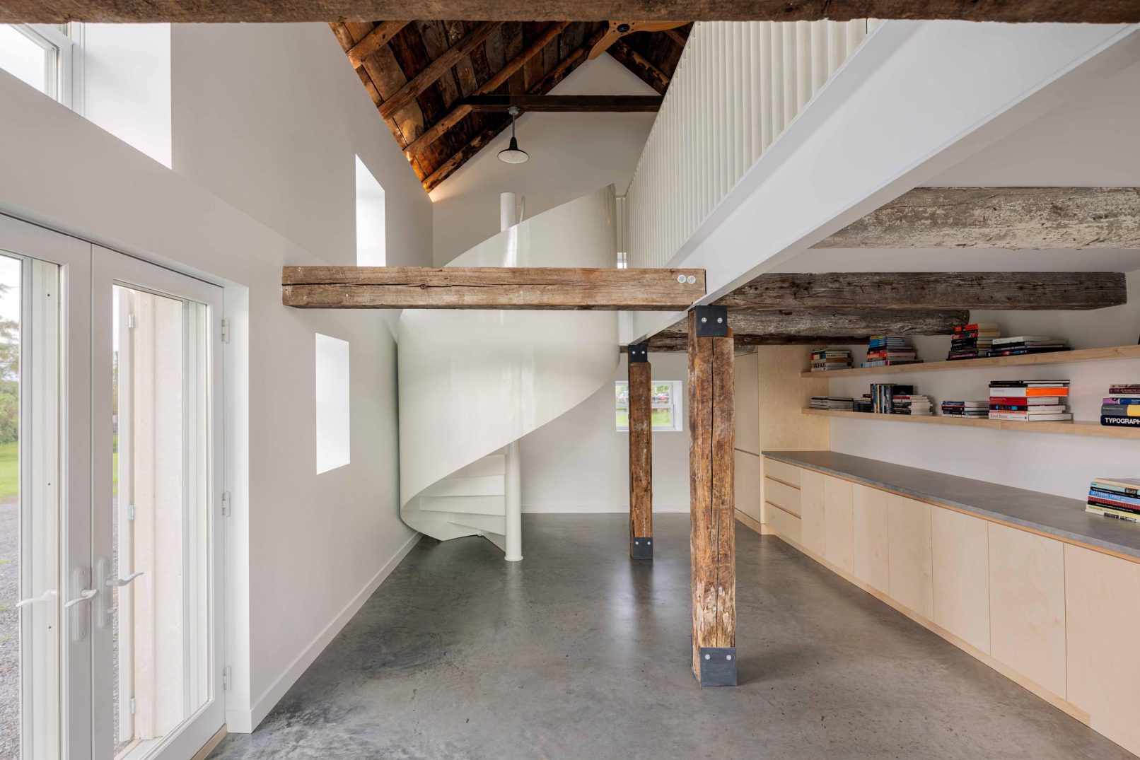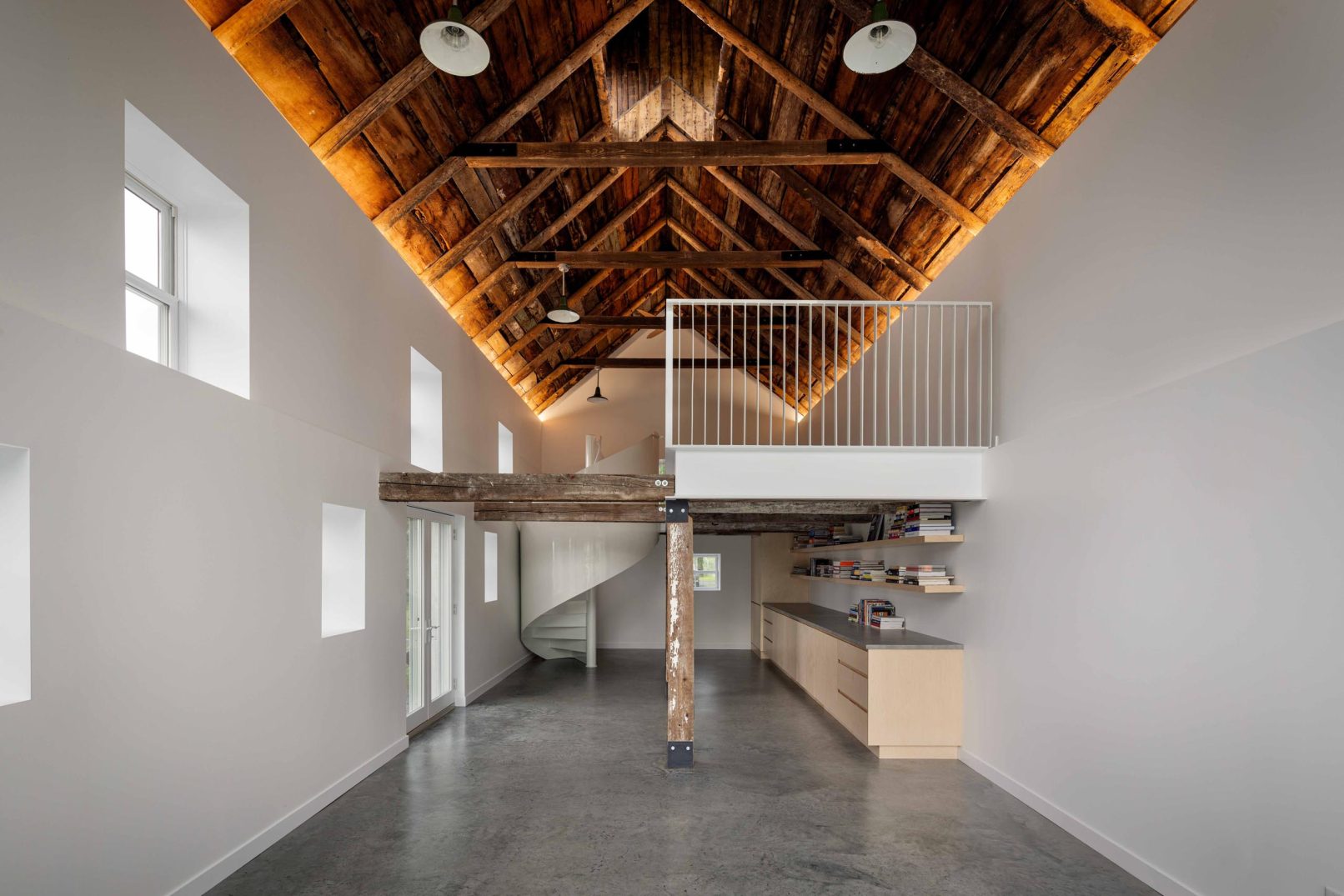 Strategic modifications included replacing the pig barn’s vent stack with a new light cupola, adding a circular stair to access the mezzanine, and extending the east exterior building face to increase floor area within the double-height section of the renovation. Throughout, new construction features a minimalist white surface to contrast with the original barn’s warm, textured materials, emphasizing the juxtaposition of old and new within the revitalized space.