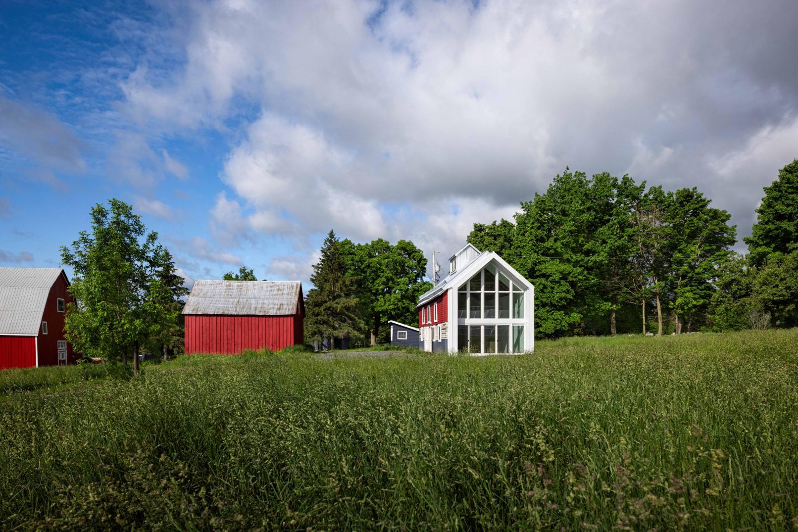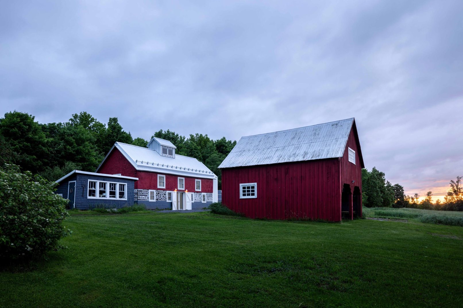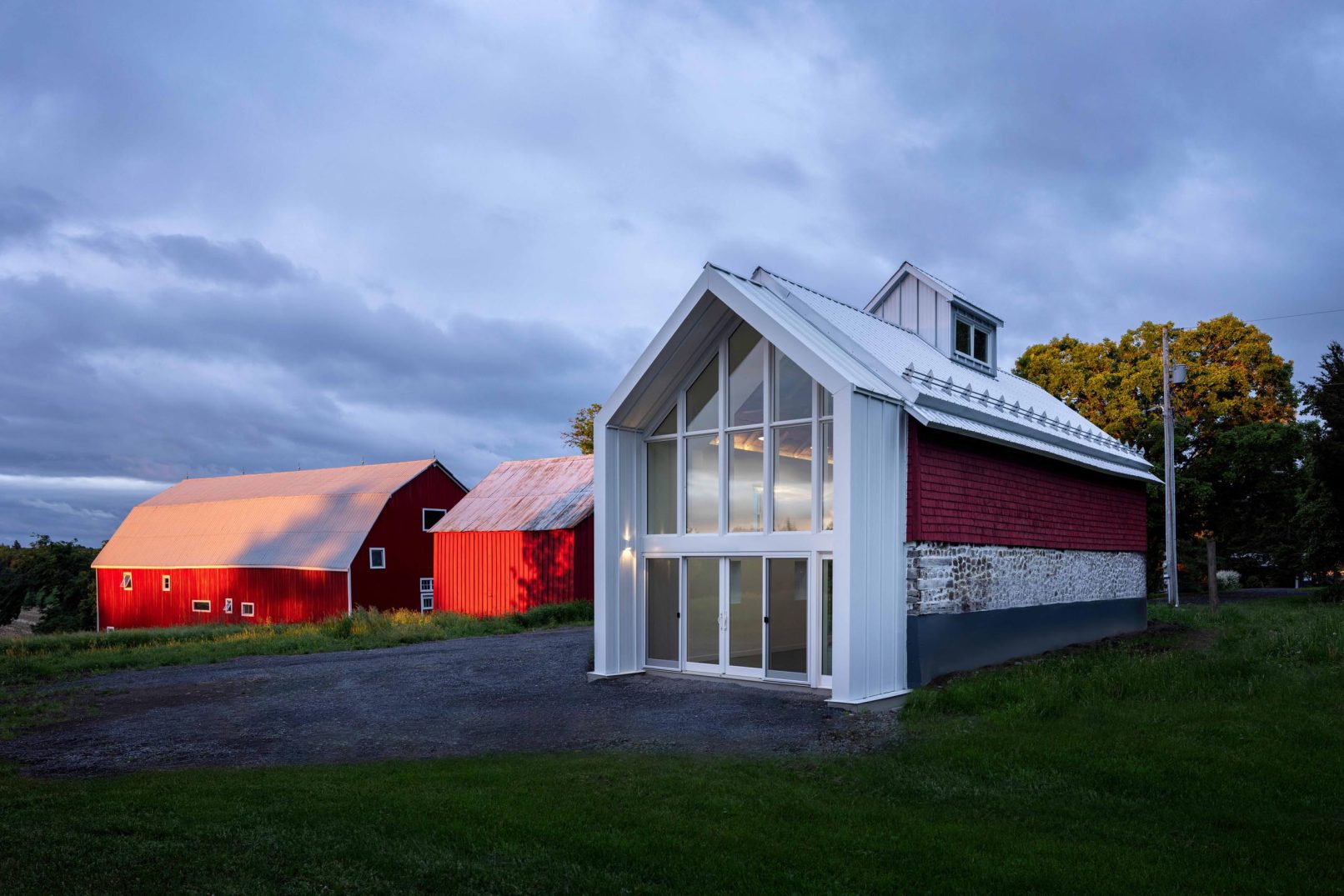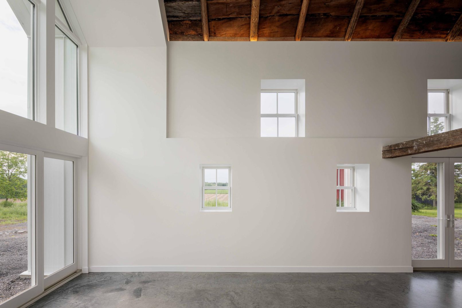 Situated among other barns on the same lot as the principal dwelling unit, the Pig & Hen Studio frames an open south-facing field overlooking the St Lawrence River and Adirondack hills, contributing to its picturesque setting. Preserving the barn’s simple yet striking architectural features was paramount, inspiring us to retain its original characteristics while adapting it for contemporary use. This approach fostered a harmonious dialogue between the old and new elements, each enhancing the overall space in distinct ways.