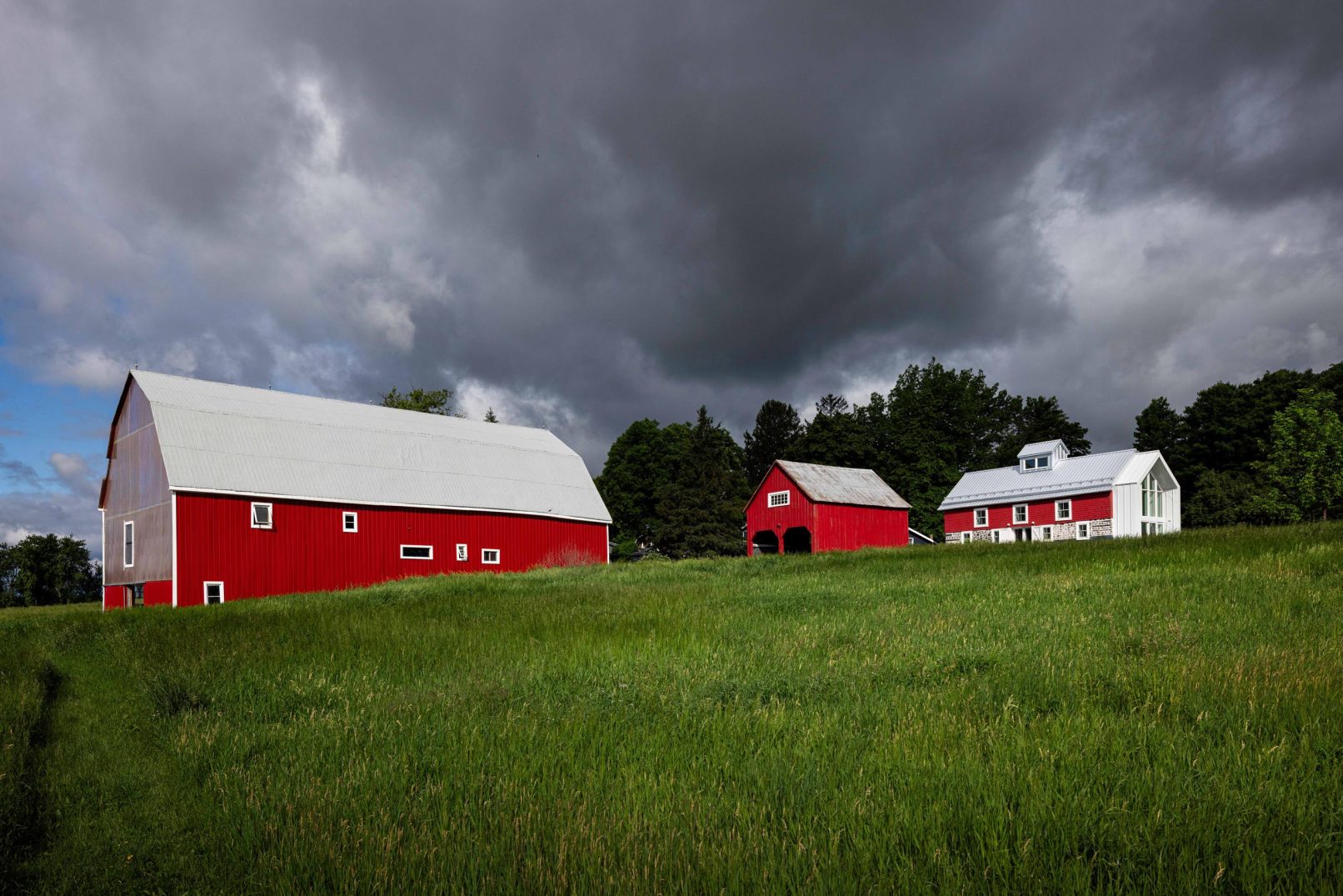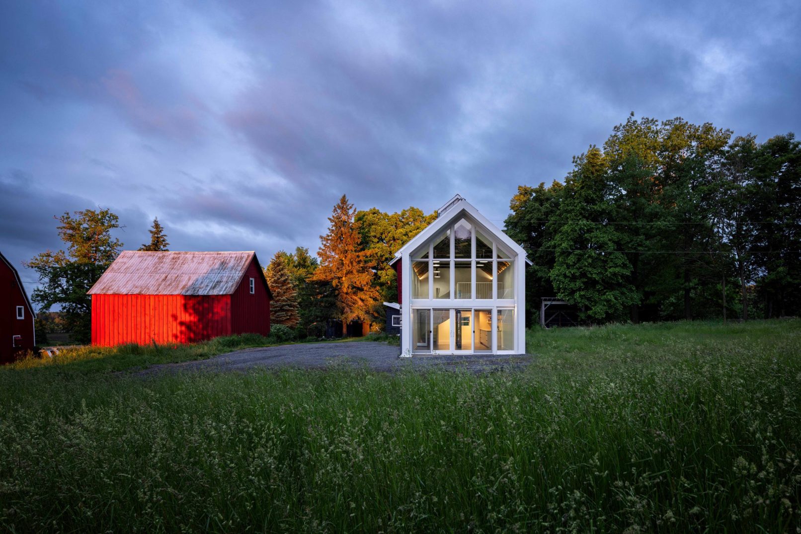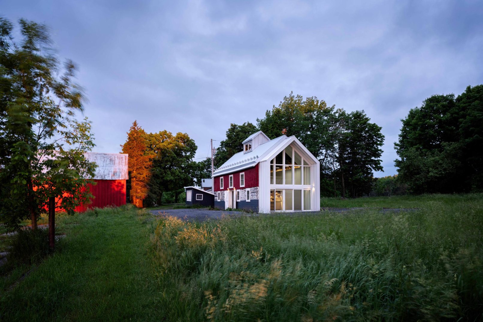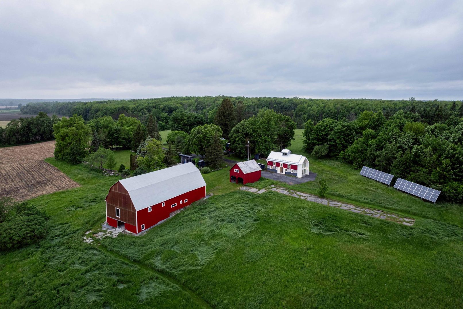 Situated among other barns on the same lot as the principal dwelling unit, the Pig & Hen Studio frames an open south-facing field overlooking the St Lawrence River and Adirondack hills, contributing to its picturesque setting. Preserving the barn’s simple yet striking architectural features was paramount, inspiring us to retain its original characteristics while adapting it for contemporary use. This approach fostered a harmonious dialogue between the old and new elements, each enhancing the overall space in distinct ways.
